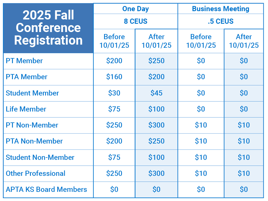 The APTA Kansas 2025 Fall Conference will be held on November 8th virtually and include a full day of educational sessions for a total CEU credit of 8.5 hours. (8 hours of educational content and .5 hours for Business Meeting)